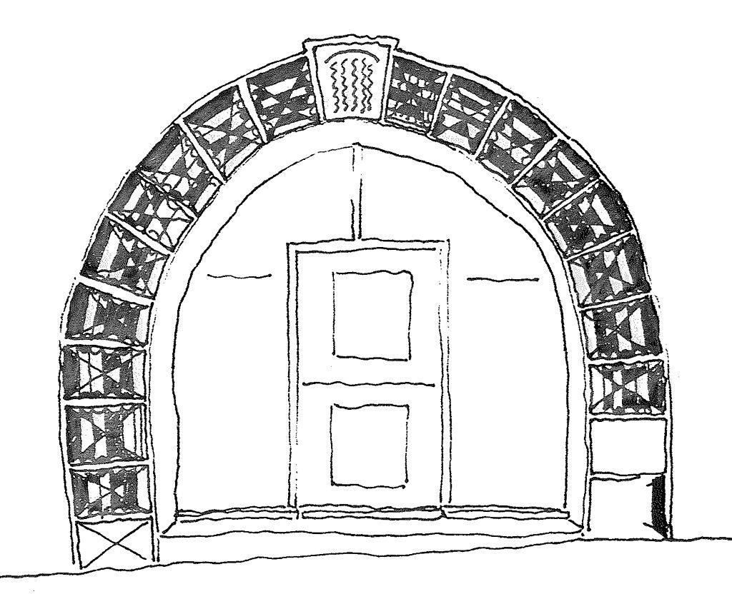 Im oberen Drittel des Dorfes stößt man auf einen mit gemalten „Ornamenten“ umrahmten Torbogen. Es ist fast so, als ob dieser Bogen vom Dorf erzählt. Wie einzelne Steine sind diese Felder um den Bogen angeordnet, auch ein deutlicher Schlussstein ist gemalt. Innerhalb dieser Felder wird das Einzelornament durch die Teilung der Fläche in sechs Streifen gebildet, die von den Diagonalen überlagert und durch kleine Halbkreise am Rand der Streifen ergänzt werden. Die entstehenden Teilflächen wurden entweder leer gelassen oder ausgemalt.