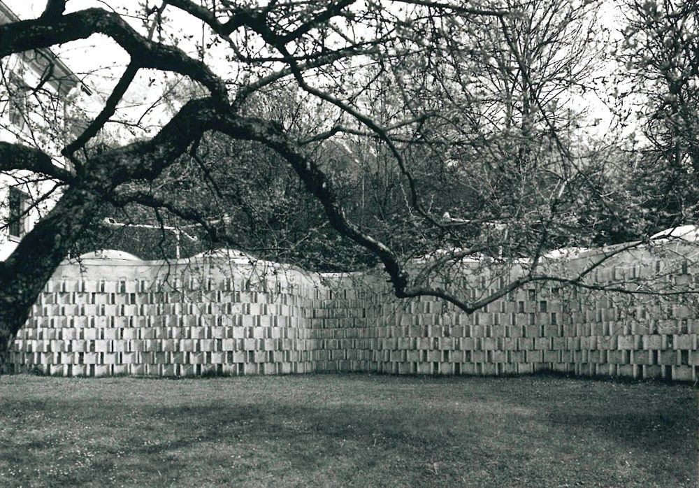 Wer weiß, in welcher Jahreszeit Josef Lackner diesen Auftrag entwickelt hat. Ich vermute fast in der unwirtlichen Winterzeit. Sein Text zum Projekt1, der wie das Bad selbst, durch seine poetische Beschreibung der Licht- und Jahreszeitenverhältnisse eine Sonderstellung in seinen Projekttexten einnimmt, reflektiert auf Höhenlage und Klima, die Art des Schwimmens und das Licht, sogar auf Sonne und Mond, Baumkronen und Farben des Himmels, aber kein Wort zur Konstruktion. Neben dem bürgerlichen, orthogonal eingeteilten, villenartigen Haus, in dem ganz oben unter Dach, nach Süden blickend, der groß gewachsene, ganz und gar nicht sportliche Paul Flora seine „Striche strichelte", entstand – skizziert aus Lackners „Pranke“ – dieses „wellige“ Gebilde im verwilderten Garten.