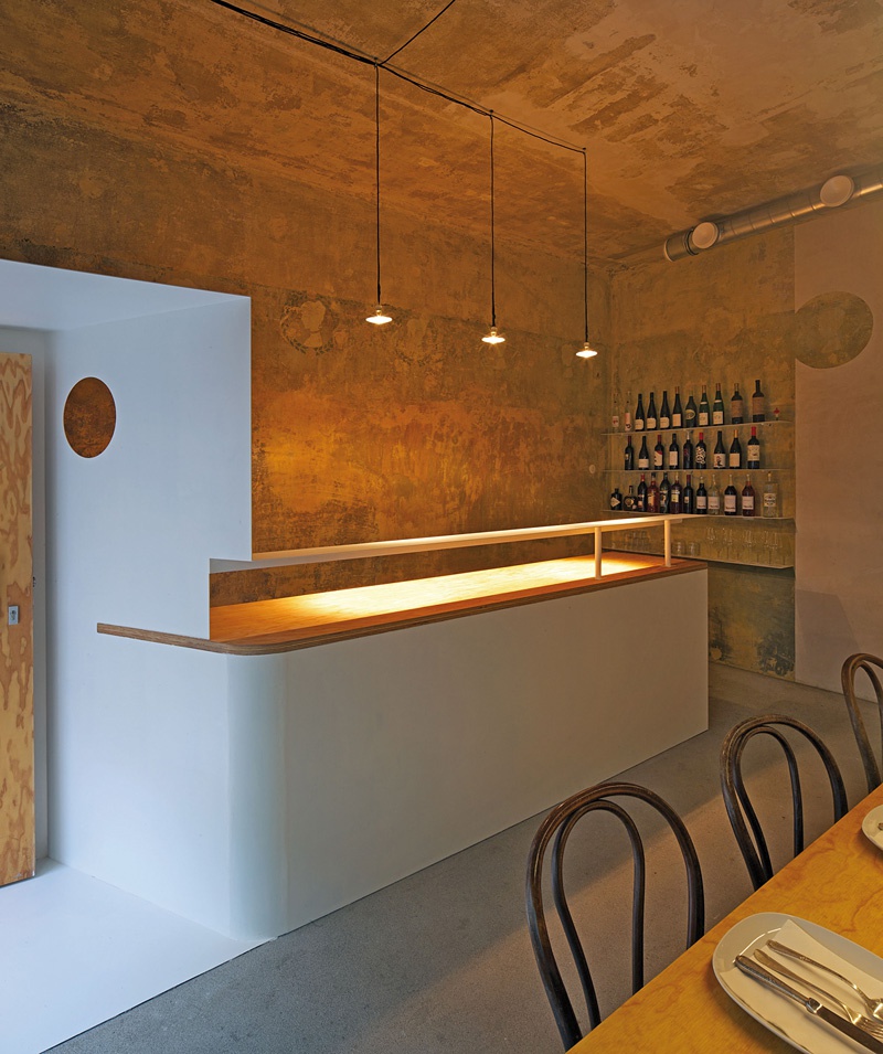 Die Verknüpfung von Straße und Innenraum entsteht einerseits durch das bestehende große Fenster mit seinem bankartigen Parapet und andererseits durch den eigentlichen architektonischen Eingriff: Unter das „Portal“, einem weißen, leicht vor die Fassade springenden flachen Blechkasten über dem großen Fenster und der Eingangstüre, stellen sie dünne weiße Laibungsbleche für den Eingang, die sich organisch zu einem weißen, blechgedeckten Vorbereich und der weißen Kochbar im Inneren entwickeln. Eine kleine runde Öffnung in der die Küche abschirmenden Blechwand des Vorbereichs erlaubt dem Koch, die eintretenden Gäste zu sehen und ergänzt das Thema der kleinen Kreise – wie das erwähnte „Frauenkopfgelenk“, die runden weißen Zuluftventile und die einfach abgehängten Glühbirnen über der Bar, die in Dialog mit dem „Strich“ der Leuchte über dem langen Esstisch für acht bis zehn Gäste treten. Dieser ist von alten Thonetstühlen umgeben und seine Kiefernsperrholzplatte auf weißem Stahlgestell spricht zum gleich materialisierten Eingangstürblatt und der nicht abgeschirmten Küchenarbeitsplatte – „denn man soll alles sehen, was ich mache“ sagt Oscar Germes.
