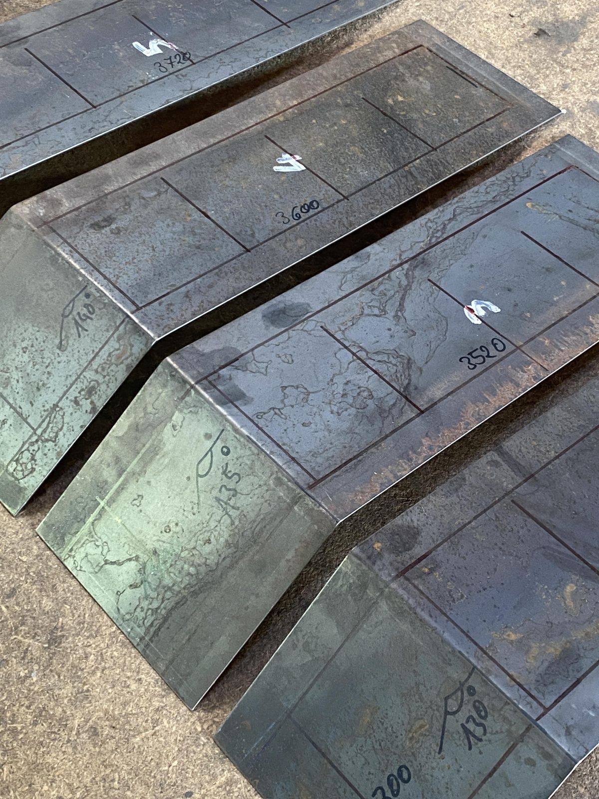 Zuerst diente ein 1:50 Modell dazu sich einer Lösung anzunähern. Recht schnell war man bei einzelnen, ca. 140 cm breiten und ca. 550 cm langen „Schuppen“ gelandet, die sich über die Abfahrt spannen sollten. Abgeknickt liegen diese auf zwei Punkten auf, recht dicht auf der einen Mauer und ganz luftig auf einer Stütze auf der anderen Mauer. Leicht überlappend lassen sie Licht zwischen den „Schuppen“ nach unten fallen. Durch die geringe Neigung und eine 3 cm hohe Aufkantung der Längsseiten wird das Regenwasser abgeleitet. Mit Hilfe eines 1:10 Modells wurden danach die verschiedensten Maße und Winkel der einzelnen Stahlblechschuppen ermittelt. Der jeweils zuerst auf die Mauern gesetzte leiterartige Winkelrost, auf den erst nach „Einrichtung“ das ca. 3 mm Stahlblech punktgeschweißt wurde, ist mit klug geplanten und ausgeführten, beweglichen Details zur Feinjustierung versehen, die den „Schlosser-Künstler“ spüren lassen.