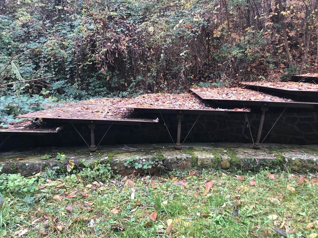 Dort, im leicht ansteigenden und im Wald endenden Vorbereich zwischen einem Nebengebäude des Schlosses und der dem dichten Laubwald zugewandten Seite, liegt die nach unten führende, leicht gekrümmte Tiefgaragenabfahrt, die durch verschieden hohe Porphyr-Mauern begleitet wird. Nachdem sich herausstellte, dass vor allem das fallende Laub eine Überdachung nötig macht, beauftragte Hans Oberrauch den Künstler und Schlossermeister Franz Messner damit, eine Lösung zu entwickeln. Franz Messner – „ein wirklicher Meister“2 – ließ seinem Sohn David, der damals kurz vor Ende des Studiums in seiner Werkstatt arbeitete, recht freie Hand, diesen Auftrag zu bearbeiten.