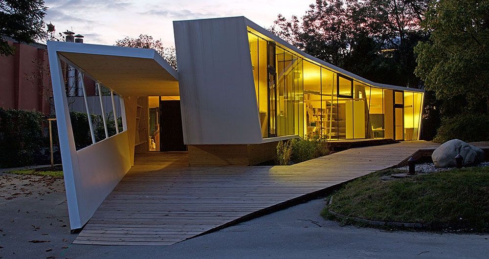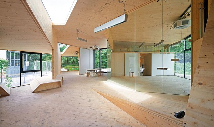 Entstanden ist ein pavillonartiges Werkstättengebäude, das nicht nur den Kindern und Jugendlichen als NutzerInnen ein optimales Raumangebot bietet, sondern auch den Park durch seine einzigartige Architektur bereichert. Vorgelagerte Terrassen und raumhohe Glasfronten verbinden den geschwungenen Baukörper mit der Umgebung, im Inneren bilden schräge Böden und Wände ein fließendes Kontinuum an Räumen mit unterschiedlichen Atmosphären und Arbeitsmöglichkeiten.