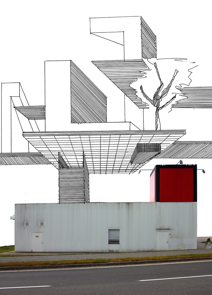Die Arbeit „Konstruktion Landschaft“ widmet sich der urbanen Peripherie, den Stadt- und Dorfrändern. Diese Landschaften mit ihren Bauten, Verkehrswegen und fehlenden konzeptionellen Zusammenhängen prägen mit ihrer gleichförmigen Gestaltung unseren Lebensraum und sind somit ein wesentlicher Aspekt unserer baukulturellen Gegenwart. Die Entwicklung dieser Gebiete erfolgt aufgrund pragmatischer Gesichtspunkte. Die Bebauungsstruktur ist gekennzeichnet durch eine punktuelle Bebauung mit 1 bis 3-geschossigen Hallenbauten, mit einer Bauhöhe zwischen 10 und 16 m, umgeben von Parkplatzflächen und Verkehrsinfrastrukturen. Funktionen, Baufelder und Widmungen werden nebeneinander aufgereiht, diese Expansion in der Fläche führt zu einem massiven Verlust der Ressource Landschaft. Der Fokus der Arbeit liegt auf dem Gestaltungsthema. Die strukturellen Veränderungen von Landschaftsräumen werden in Zeitabschnitten betrachtet. Eine fotografische Feldforschung dokumentiert alltägliche Situationen in Gewerbegebieten und städtischen und dörflichen Randzonen. Dabei wird das Vorgefundene aus seinem Kontext herausgelöst und isoliert betrachtet. Die räumlichen und atmosphärischen Qualitäten urbaner Peripherien werden dabei kritisch hinterfragt. Die Herangehensweise ist intuitiv. Durch reduzierte Zeichnungen und Collagen werden mögliche Themen der Verdichtung – das Stapeln von Funktionen, Bauplätzen, Widmungen – überlegt. Es entstehen abstrahierte Bilder, die ein Bewusstsein schaffen sollen sich auf gestalterischer und programmatischer Ebene mit der urbanen Peripherie zu beschäftigen und sie plädieren für eine vertikale, räumlich vernetzte und damit ressourceneffiziente Entwicklung.