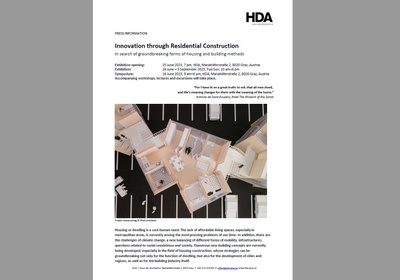 Housing or dwelling is a core human need. The lack of affordable living spaces, especially in metropolitan areas, is currently among the most pressing problems of our time. In addition, there are the challenges of climate change, a new balancing of different forms of mobility, infrastructures, questions related to social coexistence and society. Numerous new building concepts are currently being developed, especially in the field of housing construction, whose strategies can be groundbreaking not only not only for the function of dwelling, but also for the development of cities and regions, as well as for the building industry itself. The exhibition shows selected examples of contemporary architecture that demonstrate viable paths for sustainable building.
