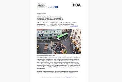The exhibition shows the results of the four-year collaboration of "Human Cities" for the project "SMOTIES - Small and remote places". Ten small, remote European places affected by a strong rural exodus were selected for the project. The selection criterion was their special significance as guardians of material and immaterial culture, which would run the risk of being undervalued, unconsolidated or passed on if lost - in other words, of being lost forever. The aim is to enhance the remote areas through joint cultural and creative activities with the residents and to develop them into contemporary places worth living in. The commitment of some so-called "local heroes" and numerous associations that actively endeavour to strengthen the community was also convincing.