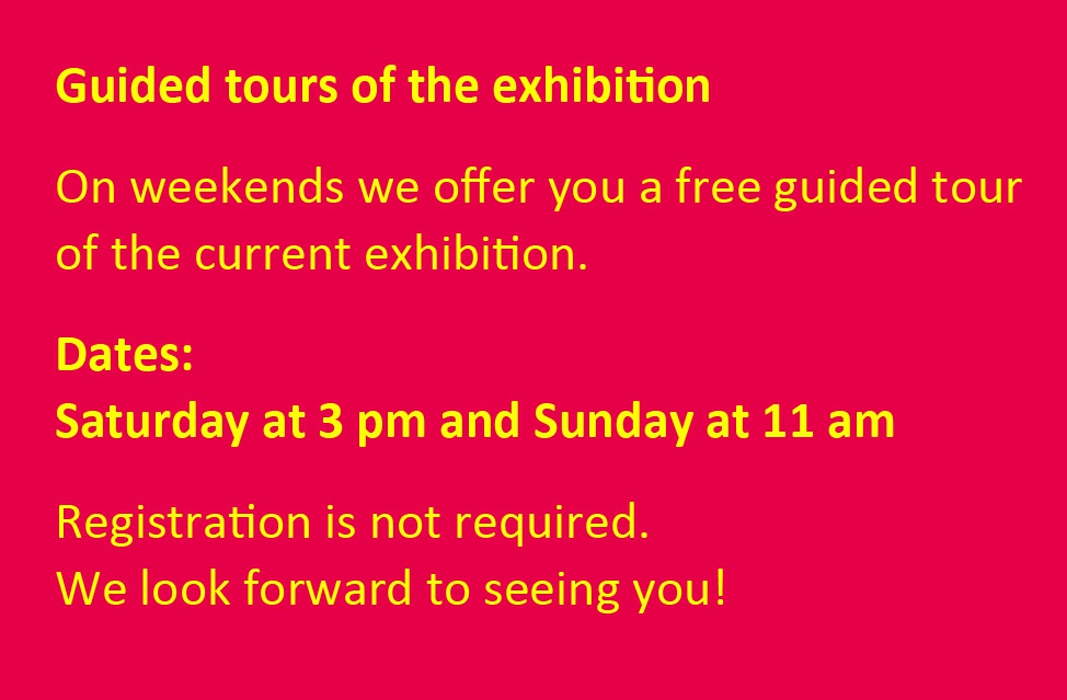 FREE GUIDED TOURS On weekends, we offer free guided tours of the ongoing exhibition every Saturday at 3 p.m. and Sunday at 11 a.m. Registration is not required.