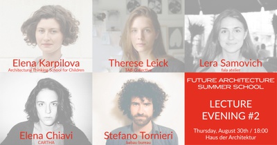 Junge aufstrebende Architekturschaffende, welche die erste Future Architecture Summer School im Haus der Architektur leiten, stellen die Denk- und Arbeitsweisen ihrer Büros/Kollektive vor: TAB Collective | Therese Leick (AT), Babau Bureau | Stefano Tornieri (IT), Architectural Thinking School for Children | Elena Karpilova (BY), fala atelier | Lera Samovich (PT), CARTHA | Elena Chiavi (CH)