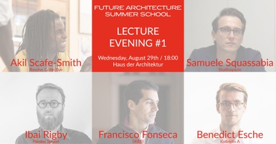 Junge aufstrebende Architekturschaffende, welche die erste Future Architecture Summer School im Haus der Architektur leiten, stellen die Denk- und Arbeitsweisen ihrer Büros/Kollektive vor: RESOLVE | Akil Scafe-Smith (GB), Studiospazio | Samuele Squassabia (IT), Parallel Sprawl | Ibai Rigby (CH), Kollektiv A | Benedict Esche (DE), SKREI | Francisco Fonseca (PT)