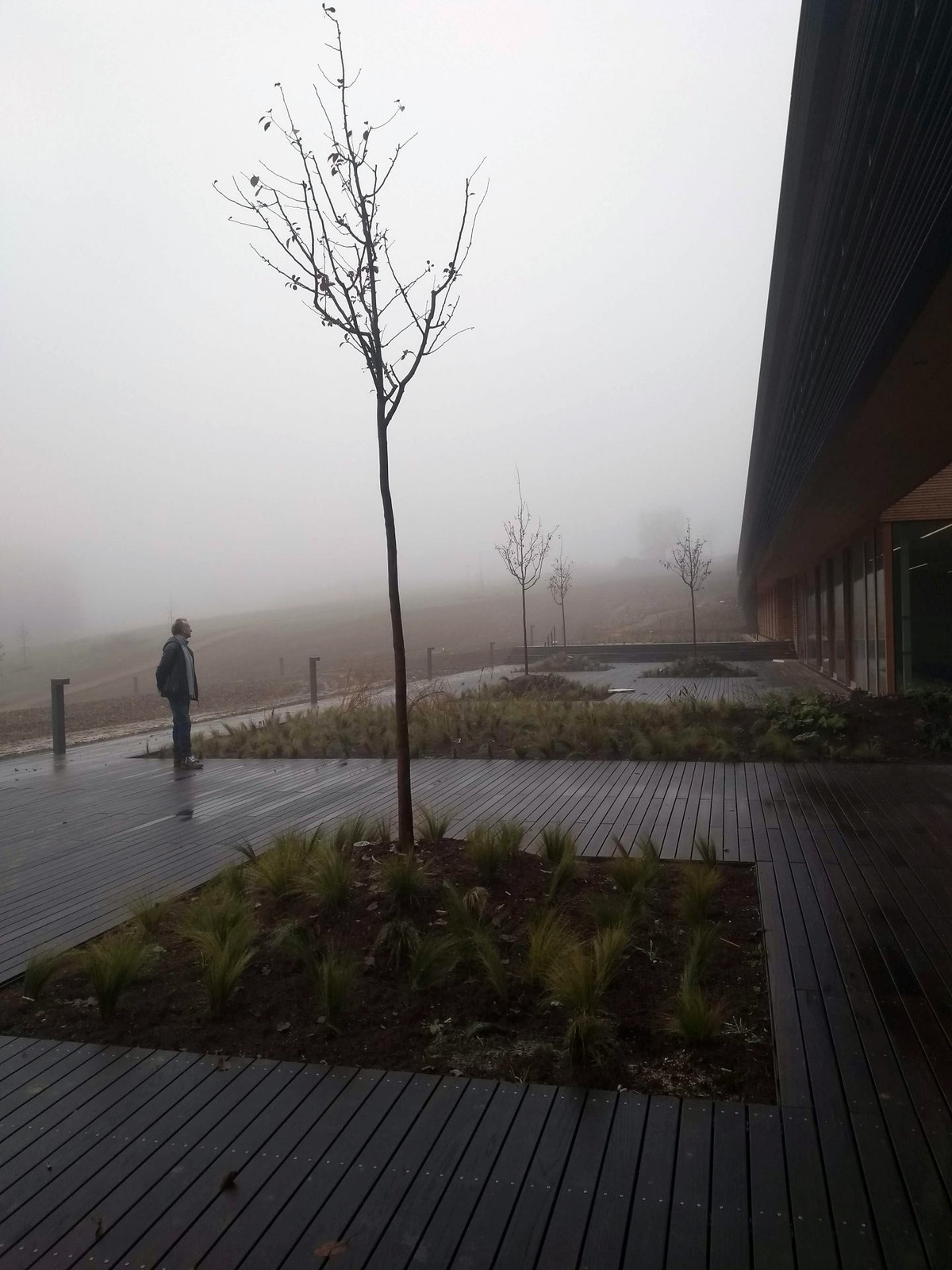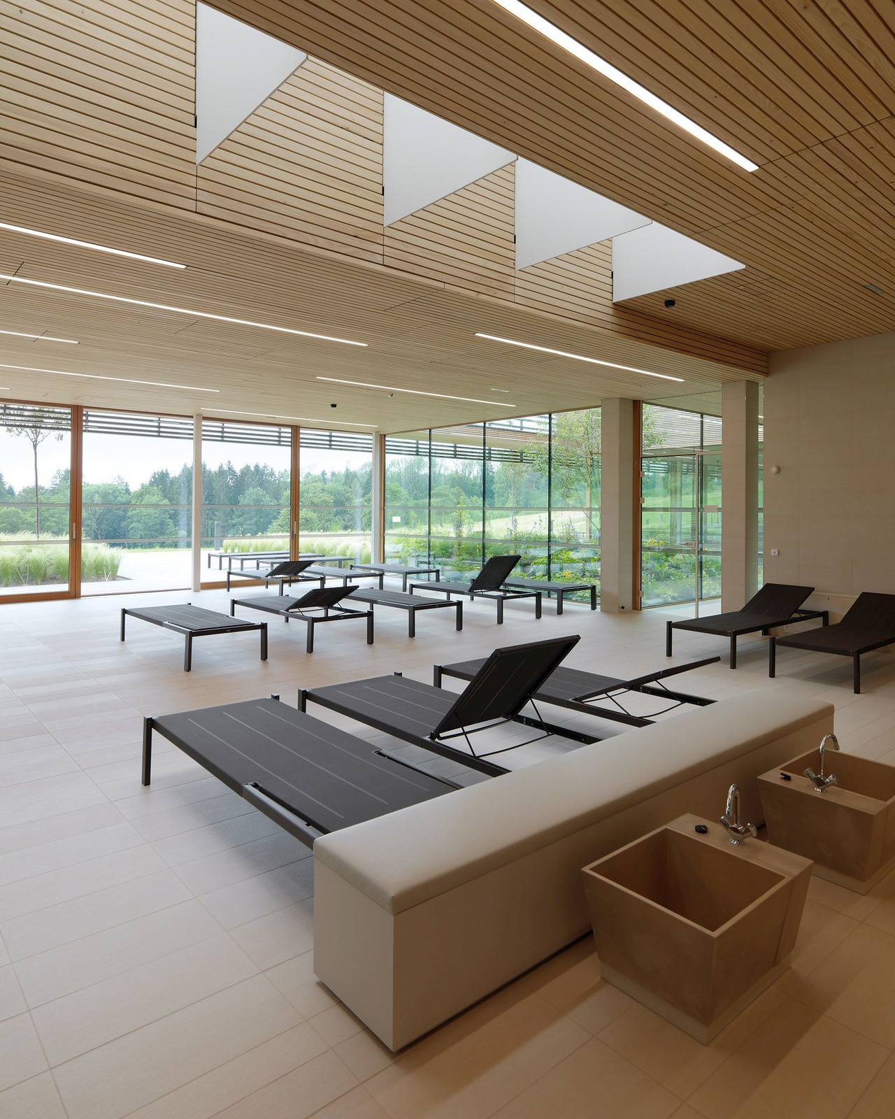 Drei schmale langgestreckte Baukörper in Holzbauweise scheinen über dem Gelände zu schweben oder graben sich ein. Atrien mit heimischer Bepflanzung sowie begrünte Dächer unterstreichen das gestalterische Anliegen, die Landschaft durch das Gebaute fließen zu lassen. Natürliche Verschattung und Belüftung ergänzen die optimierte Klimatechnik im Low-Tech Standard.