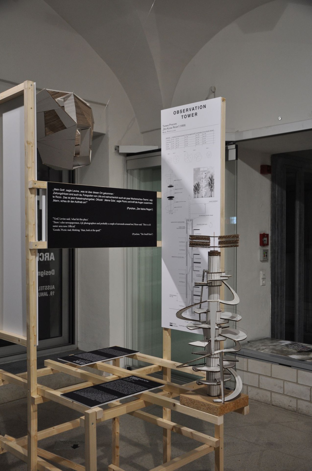 AusstellungNarrative Architecture ist eine Architektur, die aus der Narration heraus entsteht und die selbst Geschichten erzählt. Die ausgestellten Architekturmodelle sind das Ergebnis einer narrativen Strukturanalyse ausgewählter Kurzgeschichten der Weltliteratur des 20. Jahrhunderts, darunter AutorInnen wie Jorge Luis Borges, Charlotte Perkins Gilman, Franz Kafka, Ernest Hemingway und Thomas Pynchon.