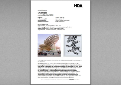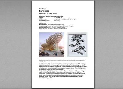 Das hier zur Verfügung gestellte Bildmaterial kann im Rahmen der Berichterstattung über die Ausstellung ENVELOPES – addressed by J.MAYER.H unter Anführung der entsprechenden Bildnachweise kostenfrei verwendet werden.