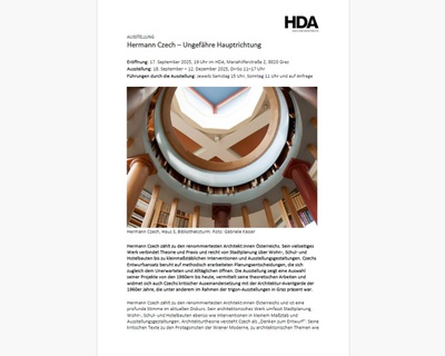 Hermann Czech zählt zu den renommiertesten Architekt:innen Österreichs. Sein vielseitiges Werk verbindet Theorie und Praxis und reicht von Stadtplanung über Wohn-, Schul- und Hotelbauten bis zu kleinmaßstäblichen Interventionen und Ausstellungsgestaltungen. Czechs Entwurfsansatz beruht auf methodisch erarbeiteten Planungsentscheidungen, die sich zugleich dem Unerwarteten und Alltäglichen öffnen. Die Ausstellung zeigt eine Auswahl seiner Projekte von den 1960ern bis heute, vermittelt seine theoretischen Arbeiten und widmet sich auch Czechs kritischer Auseinandersetzung mit der Architektur-Avantgarde der 1960er Jahre, die unter anderem im Rahmen der trigon-Ausstellungen in Graz präsent war.