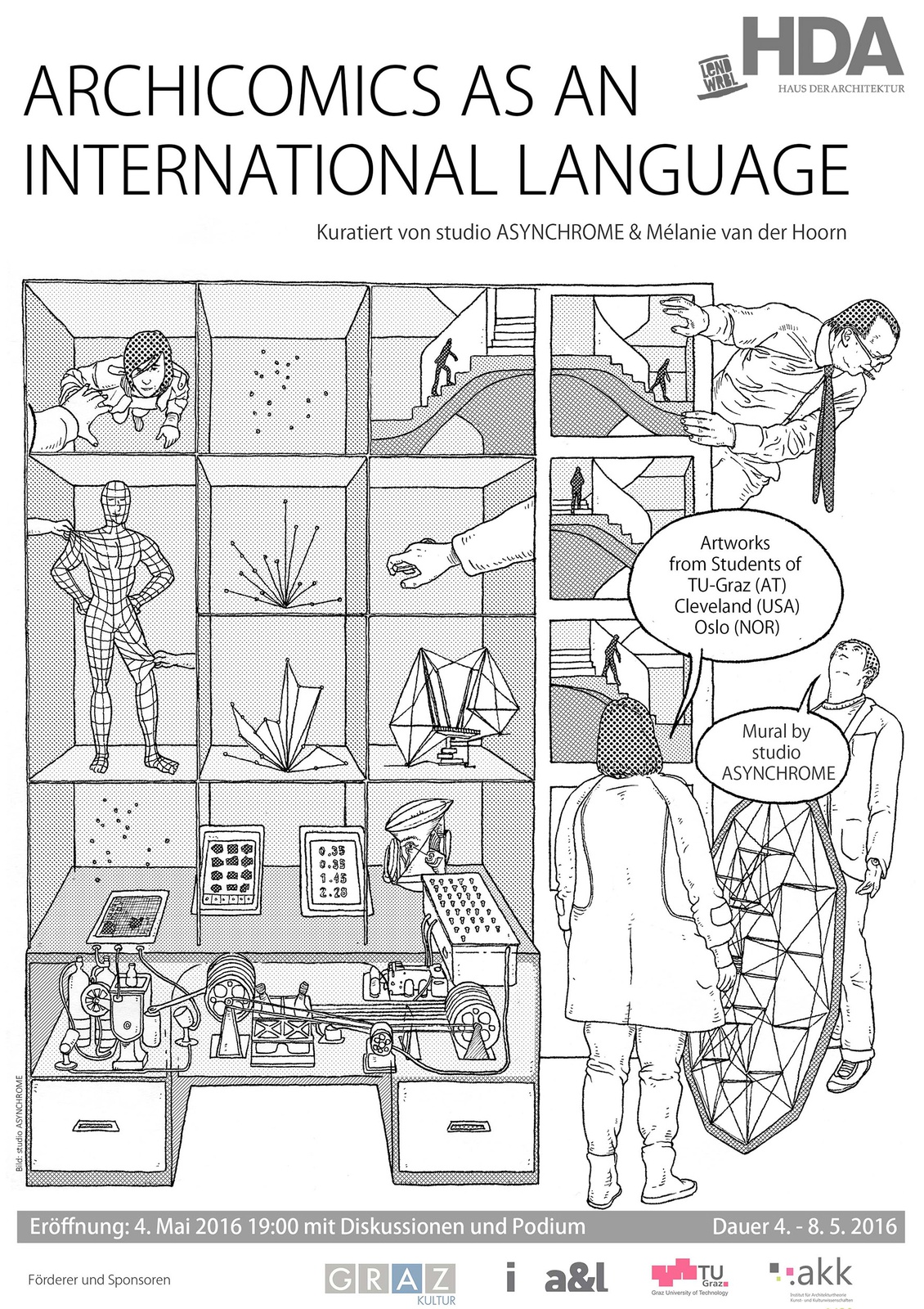 Kuratiert von studio ASYNCHROME (Niemandsräume – eine utopische Spurensuche) und Mélanie van der Hoorn (Bricks & Balloons: Architecture in Comic-Strip Form), werden in der gezeigten Ausstellung ausgewählte Comics von zukünftigen Architekturschaffenden aus Graz, Oslo und Cleveland präsentiert. Die Arbeiten sind von gesellschaftskritischem Engagement, scharfsinniger Selbstreflektion und subtilem Humor geprägt.