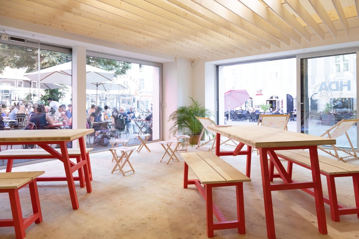 Entwurf und Ausführung der "Architektursommer-Laube" im Haus der Architektur von Janosch Webersink, Michael Hafner, Katharina Hohenwarter, Daniel Oberthaler, David Ortner, Antonia Prohammer, Leon Scheuffler, Alice Steiner und Marie Schwaighofer.