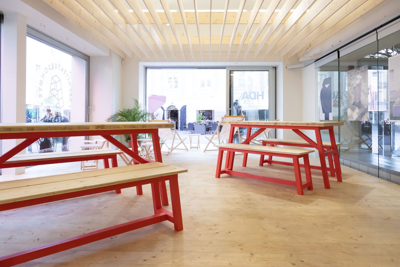 Entwurf und Ausführung der „Architektursommer-Laube“ im Haus der Architektur von Janosch Webersink, Michael Hafner, Katharina Hohenwarter, Daniel Oberthaler, David Ortner, Antonia Prohammer, Leon Scheuffler, Alice Steiner und Marie Schwaighofer.