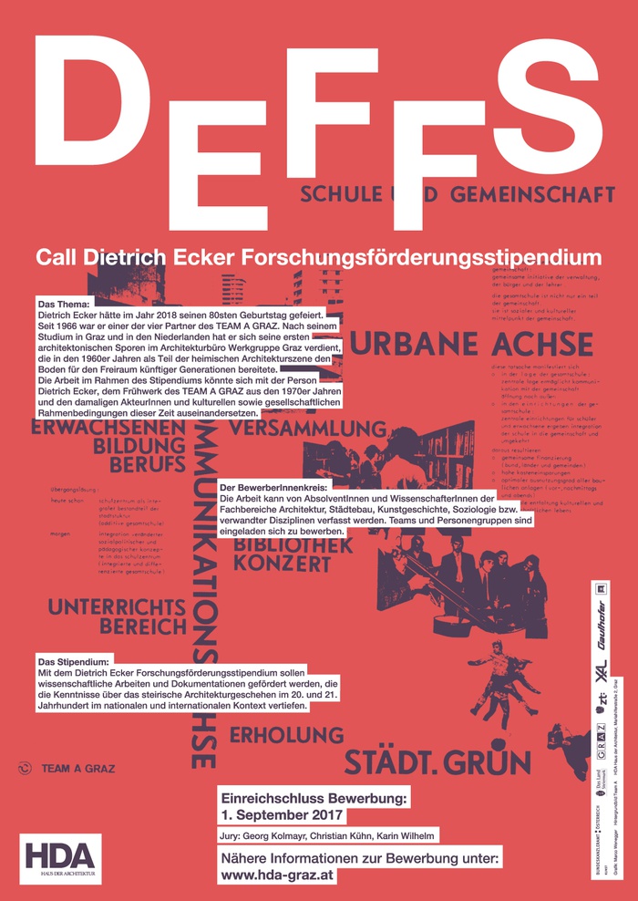 Das Thema Dietrich Ecker hätte im Jahr 2018 seinen 80sten Geburtstag gefeiert. Seit 1966 war er einer der vier Partner des TEAM A GRAZ. Nach seinem Studium in Graz und den Niederlanden hat er sich seine ersten architektonischen Sporen im Architekturbüro Werkgruppe Graz verdient, das in den 1960er Jahren, als Teil der heimischen Architekturszene, den Boden für den Freiraum künftiger Generationen bereitete. Zunächst Assistent an der Lehrkanzel für Baukunst und Entwerfen der TU Graz bei Prof. Dr. Ferdinand Schuster, hielt er von 1973 bis 1981 als Lehrbeauftragter seine Vorlesung zum Thema Moderne Architektur in der Steiermark. Die wissenschaftliche Arbeit begleitete ihn sein Leben lang. Eckers Dissertation über Herbert Eichholzer aus dem Jahr 1984 hat wesentlich zur Aufarbeitung der Moderne in der Steiermark beigetragen. Ebenso bedeutend waren die von ihm verfassten Publikationen über Architektur in Graz und der Steiermark. Die Arbeit im Rahmen des Stipendiums könnte sich mit der Person Dietrich Ecker, dem von besonderem sozialen Engagement geprägten Frühwerk des TEAM A GRAZ aus den 1970er Jahren und den AkteurInnen und kulturellen sowie gesellschaftlichen Rahmenbedingungen dieser Zeit auseinandersetzen.