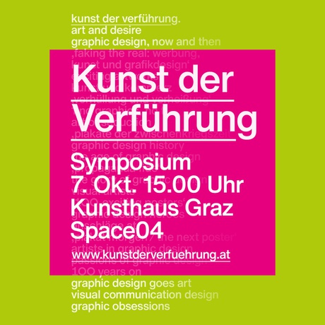 Kunst der Verführung 6 Ausstellungen zum Thema Grafik-Design im Spannungsfeld von Kunst und Werbung Initiiert vom Grafikdesigner SIGFRIED GRUBER und koordiniert von der CREATIVE INDUSTRIES STYRIA, präsentieren acht Institutionen – KUNSTHAUS GRAZ, GRAZ MUSEUM, KULTUM – Kulturzentrum bei den Minoriten, HDA – Haus der Architektur, Institut für Design und Kommunikation der FH JOANNEUM, WKO STEIERMARK – Fachgruppe Werbung & Marktkommunikation sowie ANKÜNDER – unterschiedliche Zugänge zu einem ebenso breiten wie komplexen Thema. www.kunstderverfuehrung.at