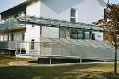 Reihenhaus mit 3 Einheiten mit Nutzflächen von je ca. 130 m2 (Länge 41 m, Tiefe 8 m) mit Untergeschoss in Massivbauweise und Obergeschoss in Holzriegelbauweise für 3 befreundete Familien, die an einer kostengünstigen und doch architektonisch anspruchsvollen Lösung interessiert sind.