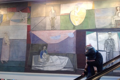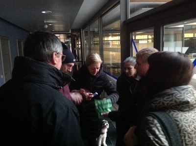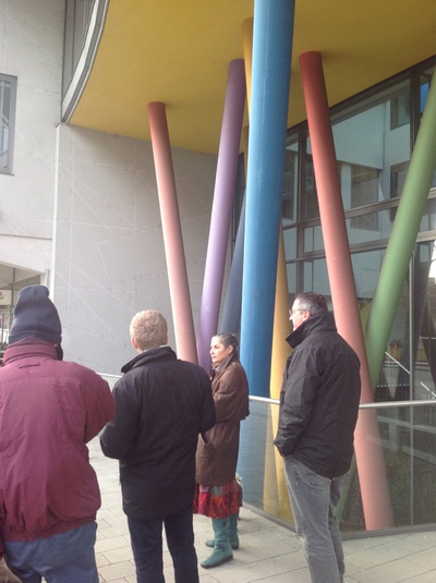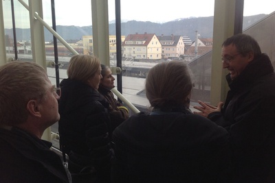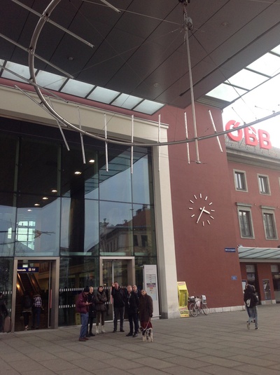 Wir machten uns gemeinsam auf den Weg durch Klagenfurt und entdeckten „Kunst am Bau“ im öffentlichen Raum. Startpunkt war die Eingangshalle im Hauptbahnhof Klagenfurt mit den bekannten Fresken von Giselbert Hoke. Über den Bahnhofsplatz, das Musil Literaturmuseum, das Landesarchiv, der WIMO, dem Verwaltungszentrum, dem Konzerthaus, der HTL und dem Amalienhof ging es Richtung Künstlerhaus und Architektur Haus Kärnten. Hier bot sich die Möglichkeit zum Besuch der Ausstellung „AUF DIE PLÄTZE – NA MESTA“.
