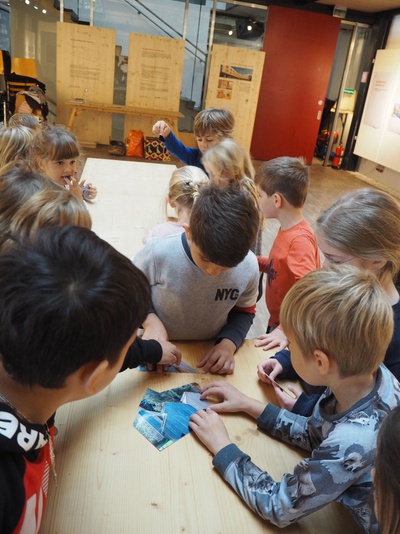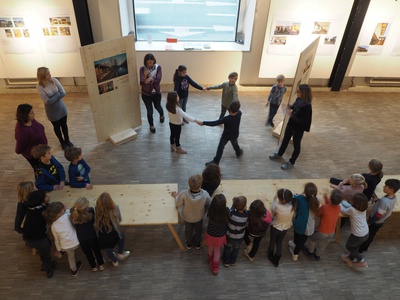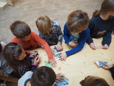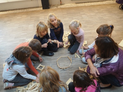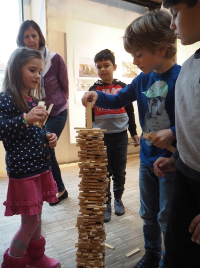 Eigenschaften von Holz entdeckten die Kinder anhand von Materialproben unterschiedlicher Holzarten. Anschließend setzten die 24 SchülerInnen Bilder der prämierten Projekte aus Puzzleteilen zusammen und untersuchten gemeinsam mit ihren Lehrerinnen Frau Michaela Müller, Frau Werjus und Frau Germ die dargestellten Gebäude auf ihre Funktion, ihre Nutzer und ihre Verwendung sowie Verarbeitung von Holz. Danach erprobten die Kinder selbst das Material und bauten in Kleingruppen Bauwerke und Tragwerke aus modularen Holzbausteinen. Dabei entstanden frei spannende Brücken, Wolkenkratzer und vieles mehr.