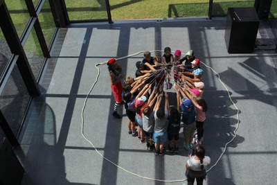 Martha Labil führt „Ohne Worte“ und auf ganz spezielle Weise durch das wunderbare STEINHAUS von Günther Domenig. Gemeinsam wird dieser Ort mit allen Sinnen erkundet. Voller Neugier und Aufmerksamkeit sammeln die Kinder gemeinsam mit Martha Eindrücke, begreifen den Raum, begehen und vermessen ihn. Nach der Erkundungstour gibt es eine kleine Pause, bei schönem Wetter im Garten. Danach werden die gesammelten Eindrücke aktiv umgesetzt in Spiele und Übungen: Pantomime, Akrobatik, Vertrauen, Balance, Gruppendynamik.