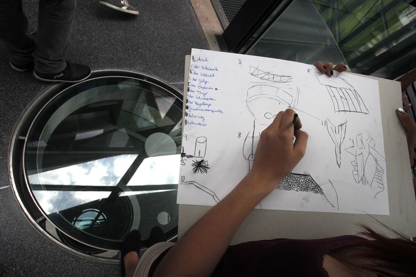 Bei diesem Projekt hatten die Schüler u. a. die Aufgabe, Gebäude-Bauteile mittels fantasievoll klingender, bildhafter Benennungen selbst im Haus zu finden und diese sprachlich und/oder zeichnerisch darzustellen.