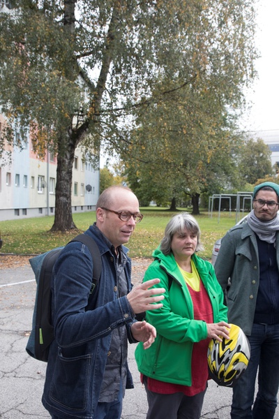Wie steht es um das soziale Bauen in Klagenfurt? Was sind die Beweggründe sich für den geförderten Wohnbau zu engagieren und welche Protagonisten wirken zusammen um hochkarätige Projekte Wirklichkeit werden zu lassen? Vor dem Architekturhaus begannen wir unsere Exkursion und radelten entspannt in das Stadtrandgebiet Harbach.