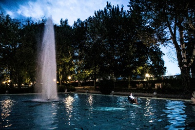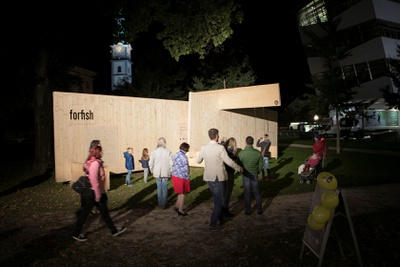 Um die 800 BesucherInnen bewegten sich während der ORF Langen Nacht der Museen zwischen der Installation FOR FISH und der Ausstellung vom Holzbaupreis Kärnten 2019. Die Installation der beiden Holzplatten wurde mit einer szenischen Lesung zum Leben erweckt. Der Schauspieler und Performance Künstler Rudolf Widerhofer las die Geschichte vom Fritz und vom Fisch in unterschiedlichen Facetten. Sitzend im Wasser vom Goetheparkbrunnen stellte er eine Verbindung zwischen dem Wasser und der Installation her.