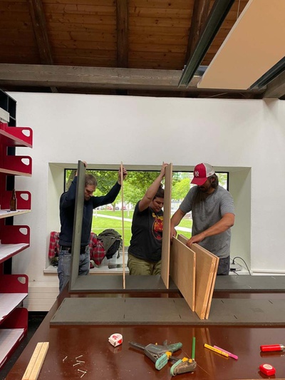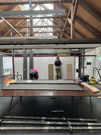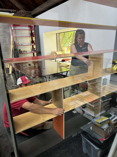 Die neuen Bücherregale wurden aus nicht mehr genutzten Platten und Beständen von bedruckten Ausstellungsmaterialien vom Architektur Haus Kärnten gebaut. Besonders die schwarz gefärbten MDF Platten der Ausstellung „Günther Domenig:DIMENSIONAL“ sind kreativ in Bücherregalen und dem mobilen Bücherturm verarbeitet.