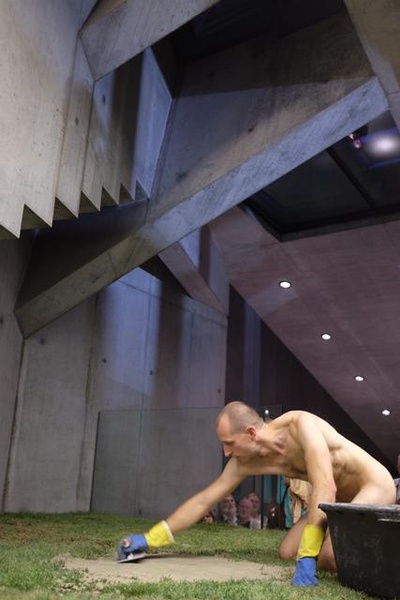 Matthias Mollner eröffnet die neue Performancereihe „Under de-Construction“, indem er sich körperlich-performativ auf die polymorphe Gestalt des Domenig Steinhaus einlässt: „Die Kammern, Treppen, Gänge und Schächte des Gebäudes werden in der Performance auf zeitlicher und räumlicher Ebene miteinander verknüpft. Ein Körper geht durch diese Ebenen hindurch, transformiert sich selbst und den Raum um ihn herum. Krümmt, was zu gerade erscheint. Gemeinsam mit dem Publikum bewegt sich der Körper durch die verschiedenen Ebenen und wird zum Gedanken, zur Nahrung, zum Eingeweide des Hauses.“