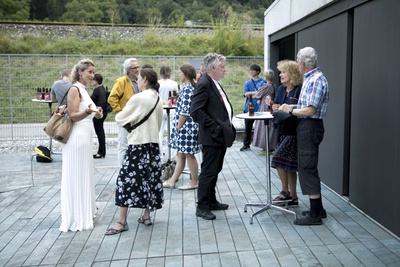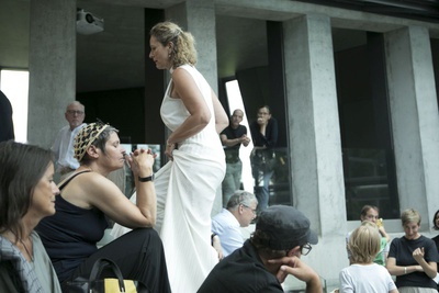 Ausgehend von der Erörterung der akustischen Begebenheiten und Besonderheiten im und um das Steinhaus und von der Befassung mit der Person Günther Domenig und seinem Werk erarbeitete Barbara Kaiser eine ortsbezogene Inszenierung mit einem Stimmensemble. Startpunkte für die Annäherung an diesen Ort bildeten für sie folgende Fragen: Welche Grundtöne lassen sich im und um das Gebäude finden? Wie lassen sich die vorgefundenen architektonischen Begebenheiten in Körperlichkeit und Klang übersetzen? Was wurde hier von Günther Domenig abgearbeitet und hat sich in diese Architekturskulptur eingeschrieben?