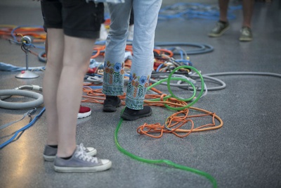 Ein Anfang. Etwas entwickelt sich, scheint zu entstehen. Um das Kleine im Großen, das Große im Kleinen erkennbar zu machen. Zwei Figuren, deren Gesichter und Haut nicht leicht gesehen werden können. Eine davon besetzt einen Ort und führt dort ein einfaches Ritual durch, bei dem sie natürliche Elemente wie Wasser, Holz, Feuer benutzt. Er/sie dürfte aus der Vergangenheit stammen und bewegt sich in die Zukunft. Die andere Figur hält nicht still, gehört nicht zu einem Platz. Sie/er hantiert mit verschieden Drähten und Kabeln, kommt wahrscheinlich aus der Zukunft und bewegt sich zurück in die Vergangenheit.