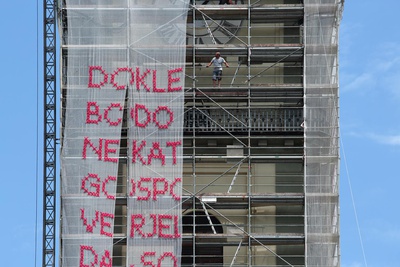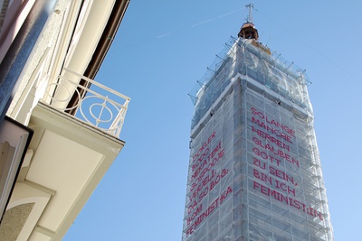 Bereits mehr als 17 mit Kabelbinder und Tüll per Hand bestickte Staubschutznetzte wurden national und international (u.A. auf der Biennale in Rabat, Marokko) auf Baustellen montiert und nun ist eine Solange-Kunstintervention von Katharina Cibulka auch in Kärnten zu sehen. Die großformatigen, im traditionellen Kreuzstich gestickten Sätze, verdeutlichen die anhaltende Notwendigkeit feministischer Forderungen. Die Themenbereiche der Solange-Sätze werden aus zahlreichen Gesprächen rund um das Thema Feminismus mit den beteiligten und betroffenen Akteur*innen vor Ort entwickelt. Könnte diese Intervention im öffentlichen Raum manche Herren dazu inspirieren ihr Verhalten zu ändern? Wielange sind SIE schon / noch Feminist:in?