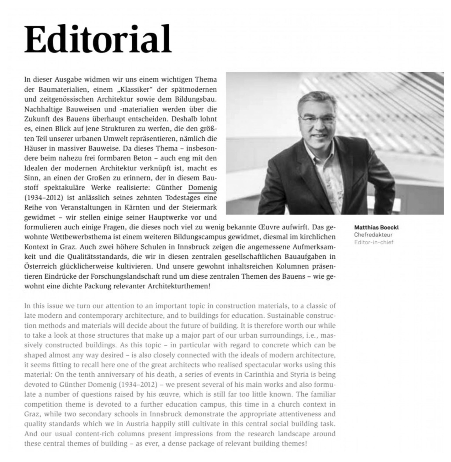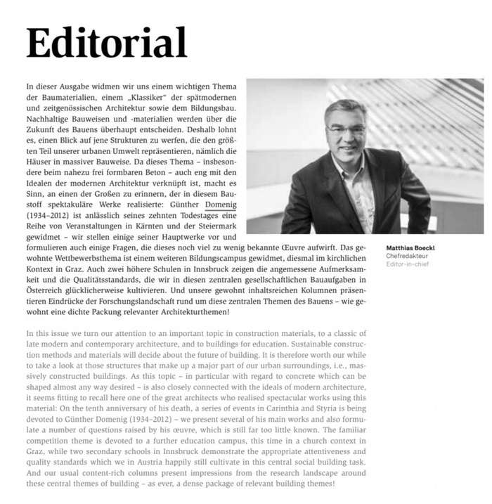 In dieser Ausgabe widmen wir uns einem wichtigen Thema der Baumaterialien, einem „Klassiker" der spätmodernen und zeitgenössischen Architektur sowie dem Bildungsbau. Nachhaltige Bauweisen und -materialien werden über die Zukunft des Bauens überhaupt entscheiden. Deshalb lohnt es, einen Blick auf jene Strukturen zu werfen, die den größten Teil unserer urbanen Umwelt repräsentieren, nämlich die Häuser in massiver Bauweise. Da dieses Thema - insbesondere beim nahezu frei formbaren Beton - auch eng mit den Idealen der modernen Architektur verknüpft ist, macht es Sinn, an einen der Großen zu erinnern, der in diesem Baustoff spektakuläre Werke realisierte: Günther Domenig (1934-2012) ist anlässlich seines zehnten Todestages eine Reihe von Veranstaltungen in Kärnten und der Steiermark gewidmet - wir stellen einige seiner Hauptwerke vor und formulieren auch einige Fragen, die dieses noch viel zu wenig bekannte Ceuvre aufwirft. Das gewohnte Wettbewerbsthema ist einem weiteren Bildungscampus gewidmet, diesmal im kirchlichen Kontext in Graz. Auch zwei höhere Schulen in Innsbruck zeigen die angemessene Aufmerksamkeit und die Qualitätsstandards, die wir in diesen zentralen gesellschaftlichen Bauaufgaben in Österreich glücklicherweise kultivieren. Und unsere gewohnt inhaltsreichen Kolumnen präsentieren Eindrücke der Forschungslandschaft rund um diese zentralen Themen des Bauens - wie gewohnt eine dichte Packung relevanter Architekturthemen!