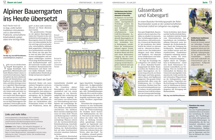 Im Zuge der Neuanlage des Lehrgartens LFS Litzlhof wird in einem Baukultur-Vermittlungsprojekt der Reihe Raum- Gestalten die Tradition des alpinen Bauerngartens ein Semester lang erforscht, ins Heute übertragen und beim gemeinsamen Bauen und Bepflanzen umgesetzt. Die gesamte Schulgemeinschaft, allen voran die Schülerinnen der 3.-C-Klasse Gartenbau, Direktor Josef Huber und Gartenbaulehrerin Luise Lackner, ist mit Landschaftsplanerin Lena Uedl-Kerschbaumer am Gartenprojekt beteiligt. Kooperationspartner sind der Verein Architektur_Spiel_Raum und die Fachhochschule Kärnten. Gefördert wird das Projekt vom Österreichischen Austauschdienst, der Architekturstiftung Österreich sowie der Kammer der ZiviltechnikerInnen. Durch die Verlegung des Fachbereichs Hauswirtschaft zum Litzlhof musste auch der wunderschöne Drauhofener Lehrgarten wehmütig zurückgelassen werden. Für einen neuen Freiland-Lehrgarten – ergänzt durch ein Lehrglashaus in Holzbauweise – stand eine durch Stützmauern terrassierte Gartenfläche zur Verfügung. Weil ein Großteil der Gartenarbeit im Rahmen des Unterrichts durchgeführt wird, mussten die Größe und der damit verbundene Pflegeaufwand an die Zeitkapazitäten angepasst werden. Vorgesehen war die Errichtung von Hochbeeten und, in Anlehnung an historische Bauerngärten, ein Vierfeldergarten mit Kreuzgang mit Blumenrabatte.