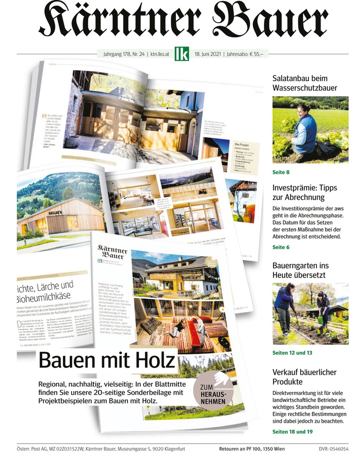 Regional, nachhaltig, vielfältig! Es gibt gute Gründe, sich für Holz als Baustoff bei Wohnraum und Wirtschaftsgebäuden zu entscheiden. Der Kärntner Bauer unterstützt Sie mit dieser 20-seitigen Sonderbeilage in Ihrer Entscheidungsfindung – in Kooperation mit proHolz Kärnten, dem Architektur Haus Kärnten und der Fachhochschule Kärnten, Campus Spittal.