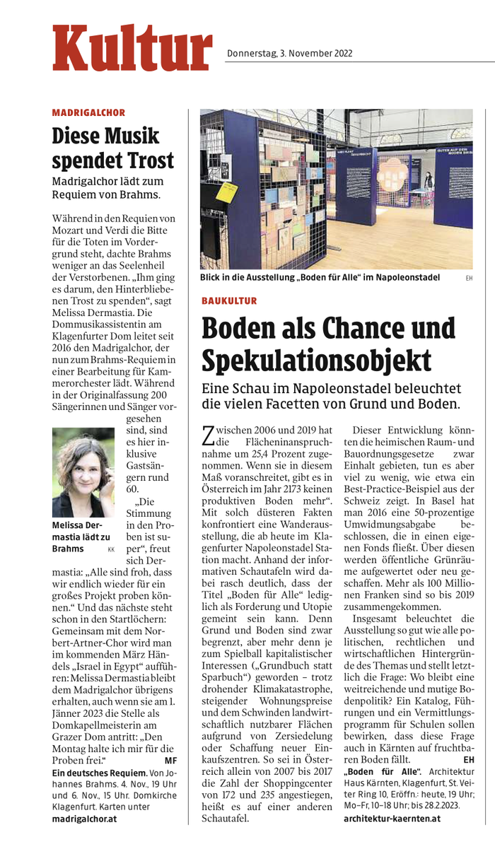 „Boden für Alle“. Architektur Haus Kärnten, Klagenfurt, St. Veiter Ring 10, Eröffn.: heute, 19 Uhr; Mo–Fr, 10–18 Uhr; bis 28.2.2023.