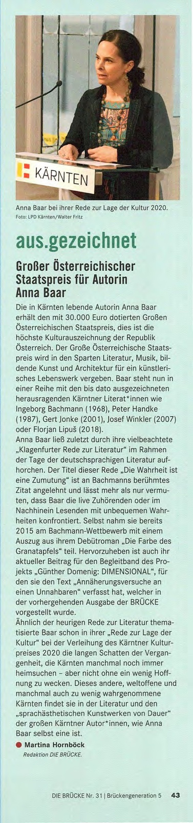 Anna Baar ließ zuletzt durch ihre vielbeachtete „Klagenfurter Rede zur Literatur" im Rahmen der Tage der deutschsprachigen Literatur aufhorchen. Der Titel dieser Rede „Die Wahrheit ist eine Zumutung" ist an Bachmanns berühmtes Zitat angelehnt und lässt mehr als nur vermuten, dass Baar die live Zuhörenden oder im Nachhinein Lesenden mit unbequemen Wahrheiten konfrontiert. Selbst nahm sie bereits 2015 am Bachmann-Wettbewerb mit einem Auszug aus ihrem Debütroman „Die Farbe des Granatapfels" teil. Hervorzuheben ist auch ihr aktueller Beitrag für den Begleitband des Projekts „Günther Domenig: DIMENSIONAL", für den sie den Text „Annäherungsversuche an einen Unnahbaren" verfasst hat, welcher in der vorhergehenden Ausgabe der BRÜCKE vorgestellt wurde.