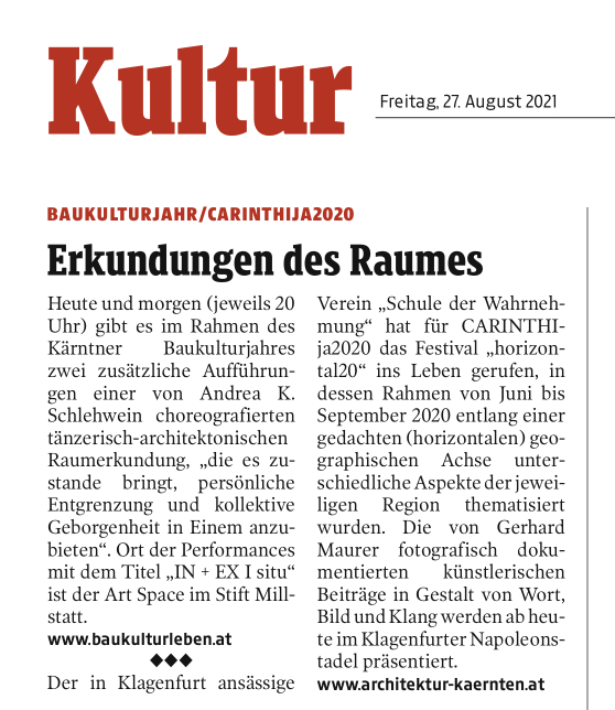 weiterlesen …Heute und morgen (jeweils 20 Uhr) gibt es im Rahmen des Kärntner Baukulturjahres zwei zusätzliche Aufführungen einer von Andrea K. Schlehwein choreografierten tänzerisch-architektonischen Raumerkundung, "die es zustande bringt, persönliche Entgrenzun und kollektive Geborgenheit in Einem anzubieten". Ort der Performances mit dem Titel "IN + EX / situ" ist der Art Space im Stift Millstatt.