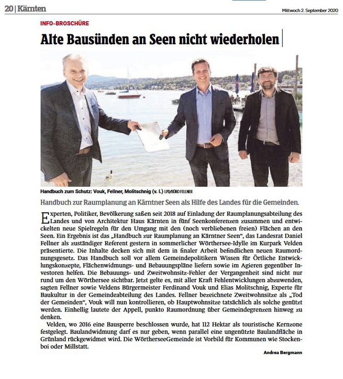 Experten, Politiker, Bevölkerung saßen seit 2018 auf Einladung der Raumplanungsabteilung des Landes und von Architektur Haus Kärnten in fünf Seenkonferenzen zusammen und entwickelten neue Spielregeln für den Umgang mit den (noch verbliebenen freien) Flächen an den Seen. Ein Ergebnis ist das „Handbuch zur Raumplanung an Kärntner Seen“, das Landesrat Daniel Fellner als zuständiger Referent gestern in sommerlicher Wörthersee-Idylle im Kurpark Velden präsentierte. Die Inhalte decken sich mit dem in finaler Arbeit befindlichen neuen Raumordnungsgesetz. Das Handbuch soll vor allem Gemeindepolitikern Wissen für Örtliche Entwicklungskonzepte, Flächenwidmungs- und Bebauungspläne liefern sowie im Agieren gegenüber Investoren helfen. Die Bebauungs- und Zweitwohnsitz-Fehler der Vergangenheit sind nicht nur rund um den Wörthersee sichtbar. Jetzt gelte es, mit aller Kraft Fehlentwicklungen abzuwenden, sagten Fellner sowie Veldens Bürgermeister Ferdinand Vouk und Elias Molitschnig, Experte für Baukultur in der Gemeindeabteilung des Landes. Fellner bezeichnete Zweitwohnsitze als „Tod der Gemeinden“, Vouk will nun kontrollieren, ob Hauptwohnsitze tatsächlich als solche genützt werden. Einhellig lautete der Appell, punkto Raumordnung über Gemeindegrenzen hinweg zu denken.