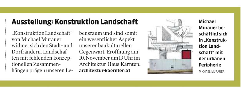 "Konstruktion Landschaft" von Michael Murauer widmet sich den Stadt- und Dorfrändern. Landschaften mit fehlenden konzeptionellen Zusammenhängen prägen unseren Lebensraum und sind somit ein wesentlicher Aspekt unserer baukulturellen Gegenwart. Eröffnung am 10. November um 19 Uhr im Architektur Haus Kärnten. architektur-kaernten.at