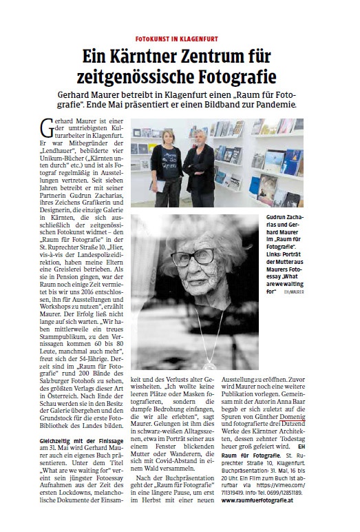 Gerhard Maurer ist einer der umtriebigsten Kulturarbeiter in Klagenfurt. Er war Mitbegründer der „Lendhauer“, bebilderte vier Unikum-Bücher („Kärnten unten durch“ etc.) und ist als Fotograf regelmäßig in Ausstellungen vertreten. Seit sieben Jahren betreibt er mit seiner Partnerin Gudrun Zacharias, ihres Zeichens Grafikerin und Designerin, die einzige Galerie in Kärnten, die sich ausschließlich der zeitgenössischen Fotokunst widmet – den „Raum für Fotografie“ in der St. Ruprechter Straße 10. „Hier, vis-à-vis der Landespolizeidirektion, haben meine Eltern eine Greislerei betrieben. Als sie in Pension gingen, war der Raum noch einige Zeit vermietet bis wir uns 2016 entschlossen, ihn für Ausstellungen und Workshops zu nutzen“, erzählt Maurer. Der Erfolg ließ nicht lange auf sich warten. „Wir haben mittlerweile ein treues Stammpublikum, zu den Vernissagen kommen 60 bis 80 Leute, manchmal auch mehr“, freut sich der 54-Jährige. Derzeit sind im „Raum für Fotografie“ rund 200 Bände des Salzburger Fotohofs zu sehen, des größten Verlags dieser Art in Österreich. Nach Ende der Schauwerden sie in den Besitz der Galerie übergehen und den Grundstock für die erste Foto-Bibliothek des Landes bilden. Gleichzeitig mit der Finissage am 31. Mai wird Gerhard Maurer auch ein eigenes Buch präsentieren. Unter dem Titel „What are we waiting for“ vereint sein jüngster Fotoessay Aufnahmen aus der Zeit des ersten Lockdowns, melancholische Dokumente der Einsamkeit und des Verlusts alter Gewissheiten.