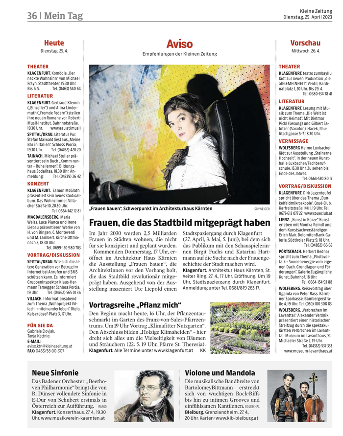 Kommenden Donnerstag, 17 Uhr, eröffnet im Architektur Haus Kärnten die Ausstellung „Frauen bauen“, die Architektinnen vor den Vorhang holt, die das Stadtbild revolutionär mitgeprägt haben. Ausgehend von der Ausstellung inszeniert Ute Liepold einen Stadtspaziergang durch Klagenfurt (27. April, 3. Mai, 5. Juni), bei dem sich das Publikum mit den Schauspielerinnen Birgit Fuchs und Katarina Hartmann auf die Suche nach der Frauengeschichte der Stadt machen wird.