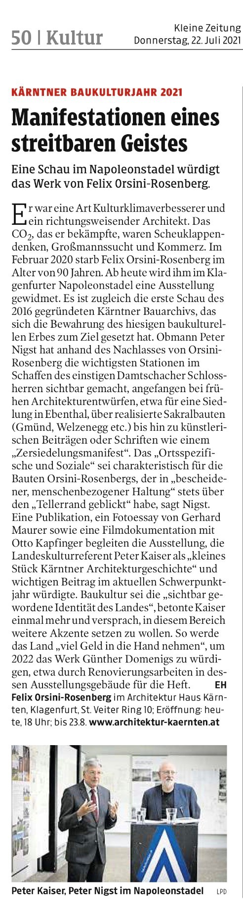 Er war eine Art Kulturklimaverbesserer und ein richtungsweisender Architekt. Das CO2, das er bekämpfte, waren Scheuklappendenken, Großmannssucht und Kommerz. Im Februar 2020 starb Felix Orsini-Rosenberg im Alter von 90 Jahren. Ab heute wird ihm im Klagenfurter Napoleonstadel eine Ausstellung gewidmet. Es ist zugleich die erste Schau des 2016 gegründeten Kärntner Bauarchivs, das sich die Bewahrung des hiesigen baukulturellen Erbes zum Ziel gesetzt hat. Obmann Peter Nigst hat anhand des Nachlasses von Orsini-Rosenberg die wichtigsten Stationen im Schaffen des einstigen Damtschacher Schlossherren sichtbar gemacht, angefangen bei frühen Architekturentwürfen, etwa für eine Siedlung in Ebenthal, über realisierte Sakralbauten (Gmünd, Welzenegg etc.) bis hin zu künstlerischen Beiträgen oder Schriften wie einem „Zersiedelungsmanifest“. Das „Ortsspezifische und Soziale“ sei charakteristisch für die Bauten Orsini-Rosenbergs, der in „bescheidener, menschenbezogener Haltung“ stets über den „Tellerrand geblickt“ habe, sagt Nigst. Eine Publikation, ein Fotoessay von Gerhard Maurer sowie eine Filmdokumentation mit Otto Kapfinger begleiten die Ausstellung, die Landeskulturreferent Peter Kaiser als „kleines Stück Kärntner Architekturgeschichte“ und wichtigen Beitrag im aktuellen Schwerpunktjahr würdigte. Baukultur sei die „sichtbar gewordene Identität des Landes“, betonte Kaiser einmal mehr und versprach, in diesem Bereich weitere Akzente setzen zu wollen. So werde das Land „viel Geld in die Hand nehmen“, um 2022 das Werk Günther Domenigs zu würdigen, etwa durch Renovierungsarbeiten in dessen Ausstellungsgebäude für die Heft.EH