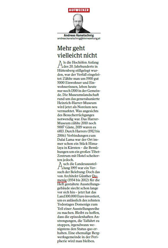 Als die Hochöfen Anfang des 20. Jahrhunderts in Hüttenberg stillgelegt wurden, war der Verfall eingeleitet: Zählte man um 1900 gut 5000 Einwohner und Einwohnerinnen, leben heute nur noch 1300 in der Gemeinde. Die Museumslandschaft rund um das generalsanierte Heinrich-Harrer-Museum wird jetzt als Noreium neu vermarktet. Was angesichts des Besucherrückganges notwendig war. Das Harrer-Museum zählte 2010 noch 9007 Gäste, 2019 waren es 6813. Durch Harrers (1912 bis 2006) Verbindungen zum Dalai Lama war der Ort immer schon ein Stück Himalaya in Kärnten – die Bemühungen um ein großes Tibet-Zentrum mit Hotel scheiterten jedoch.