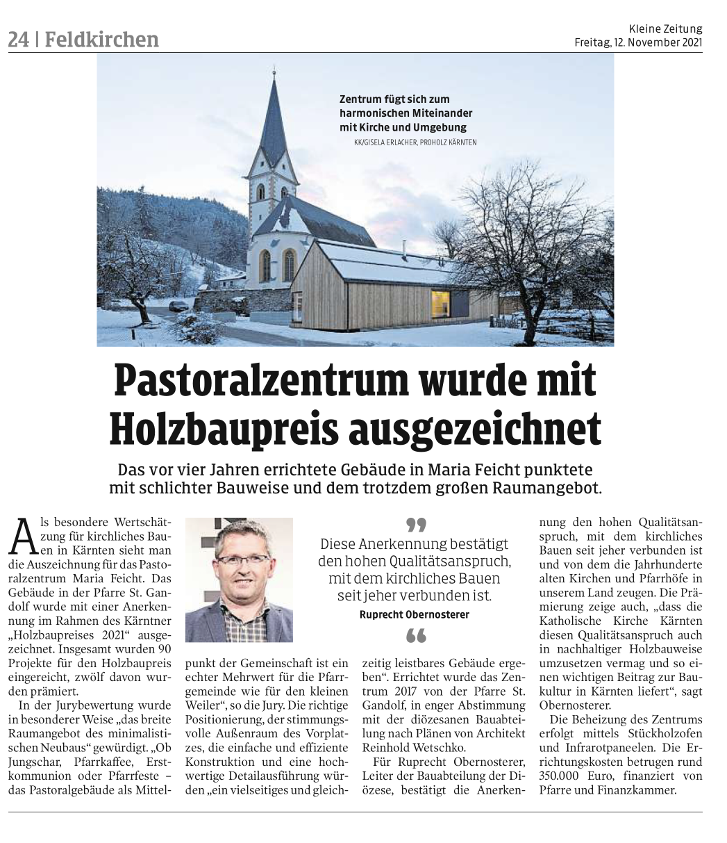 Als besondere Wertschätzung für Kirchliches Bauen in Kärnten sieht man die Auszeichnung für das Pastoralzentrum Maria Feicht. Das Gebäude in der Pfarre St. Gandolf wurde mit einer Anerkennung im Rahmen der des Kärntner „Holzbaupreises 2021“ ausgezeichnet. Insgesamt wurden 90 Projekte für den Holzbaupreis eingereicht, 12 davon wurden prämiert.