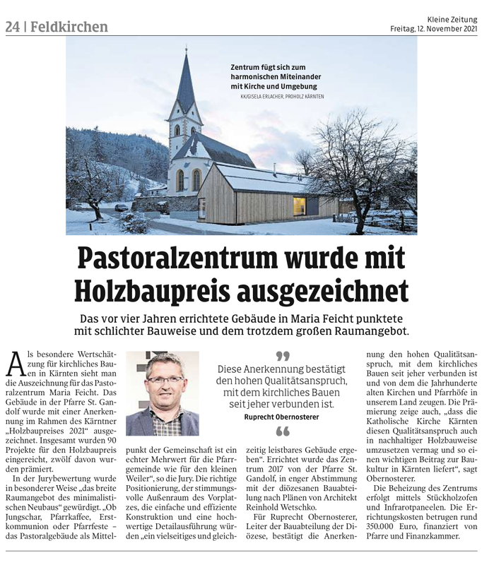 Kleine Zeitung: "Pastoralzentrum wurde mit Holzbaupreis ausgezeichnet"