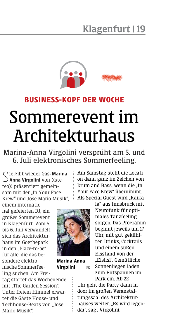 Sie gibt wieder Gas: Marina-Anna Virgolini von ((stereo)) präsentiert gemeinsam mit der „In Your Face Krew“ und Jose Mario Musik“, einem international gefeierten DJ, ein großes Sommerevent in Klagenfurt. Vom 5. bis 6. Juli verwandelt sich das Architekturhaus im Goethepark in den „Place-to-be“ für alle, die das besondere elektronische Sommerfeeling suchen. Am Freitag startet das Wochenende mit „The Garden Session“. Unter freiem Himmel erwartet die Gäste House- und Techhouse-Beats von „Jose Mario Musik“. Am Samstag steht die Location dann ganz im Zeichen von Drum and Bass, wenn die „In Your Face Krew“ übernimmt. Als Special Guest wird „Kaikala“ aus Innsbruck mit Neurofunk für optimales Tanzfeeling sorgen. Das Programm beginnt jeweils um 17 Uhr, mit gut gekühlten Drinks, Cocktails und einem süßen Eisstand von der „Eislisl“. Gemütliche Sonnenliegen laden zum Entspannen im Park ein. Ab 22 Uhr geht die Party dann indoor im großen Veranstaltungssaal des Architekturhauses weiter. „Es wird legendär“, sagt Virgolini.