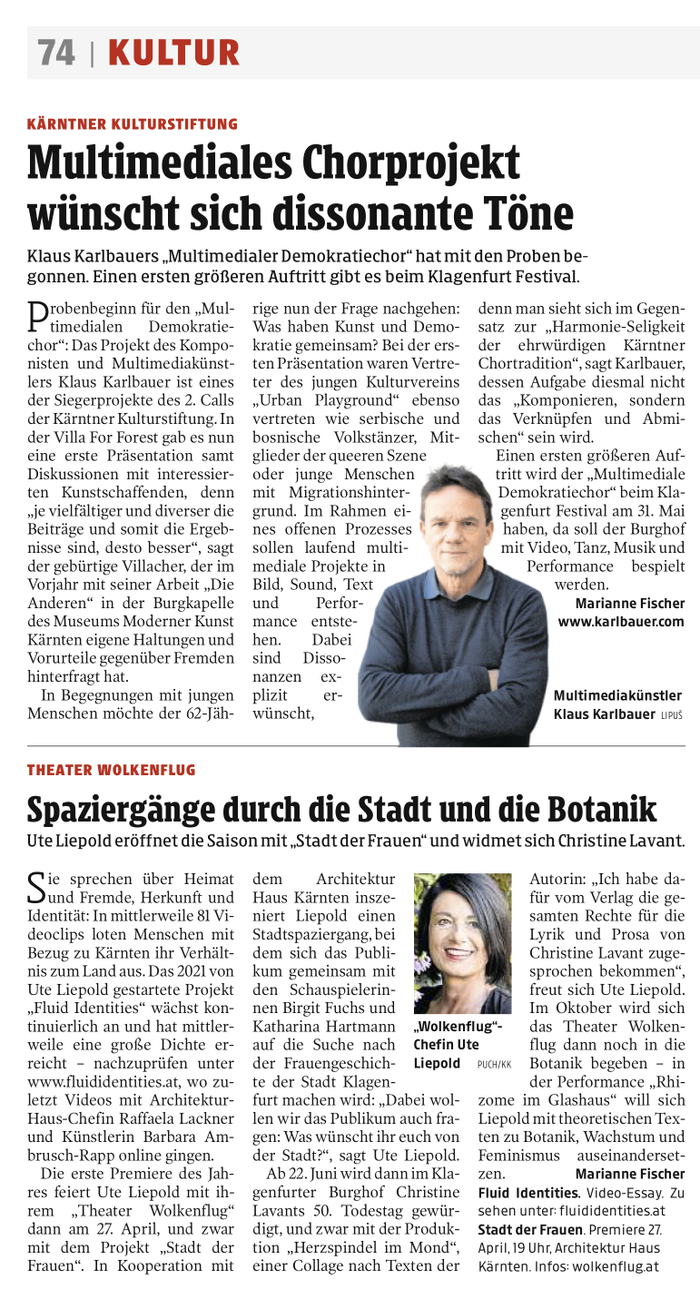 Die erste Premiere des Jahres feiert Ute Liepold mit ihrem „Theater Wolkenflug“ dann am 27. April, und zwar mit dem Projekt „Stadt der Frauen“. In Kooperation mit dem Architektur Haus Kärnten inszeniert Liepold einen Stadtspaziergang, bei dem sich das Publikum gemeinsam mit den Schauspielerinnen Birgit Fuchs und Katharina Hartmann auf die Suche nach der Frauengeschichte der Stadt Klagenfurt machen wird: „Dabei wollen wir das Publikum auch fragen: Was wünscht ihr euch von der Stadt?“, sagt Ute Liepold.