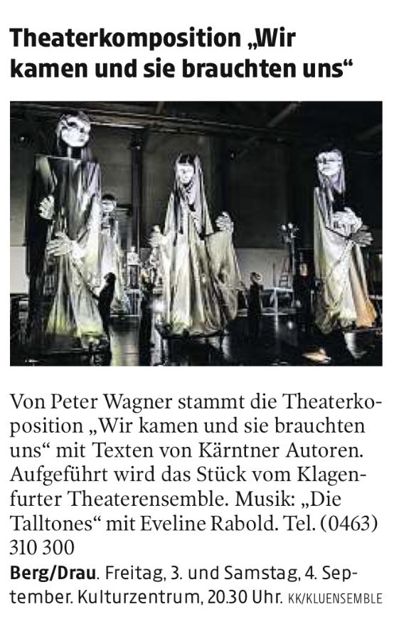 Von Peter Wagner stammt die Theaterkonposition "Wir kamen und sie brauchten uns" mit Texten von Kärntner Autoren. Aufgeführt wird das Stück vom Klagenfurter Theaterensemle. Musik: "Die Talltones" mit Eveline Rapold.